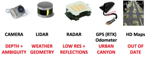 A self-driving car requires many different technologies, for example — LIDAR to create a precise 3-D image of the local surroundings, radar for ranging targets using a different part of the EM spectrum, cameras to read signs and detect color, high-definition maps for localization, and more.